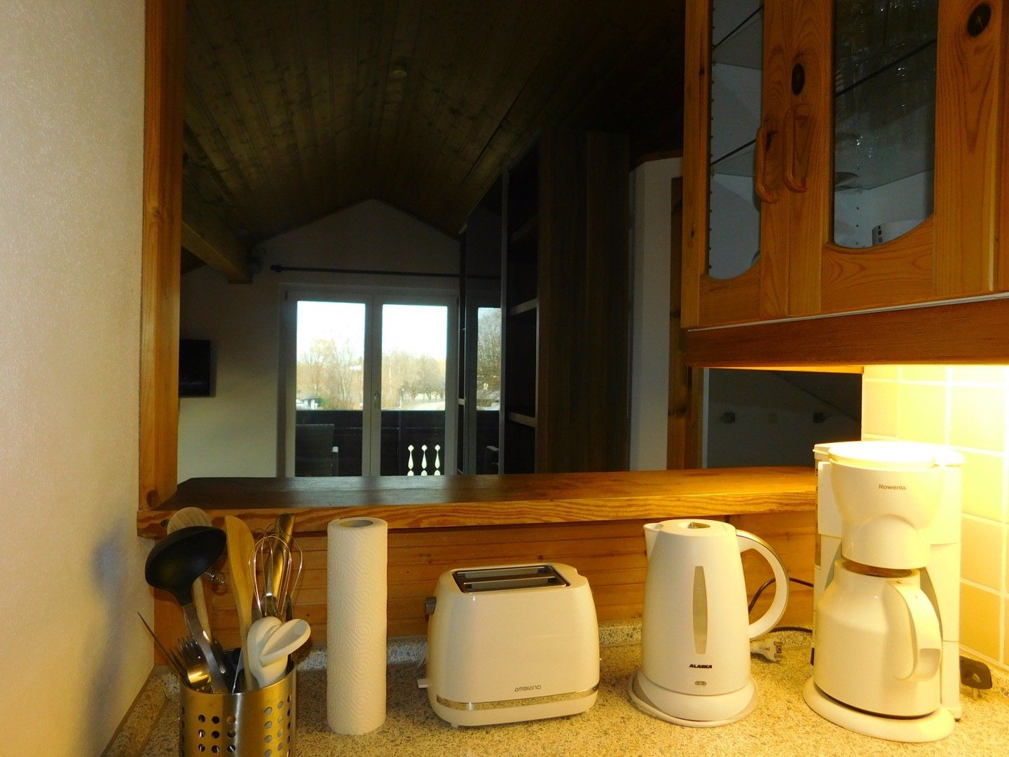 Ausgestattete, kleine Küche mit Kühlschrank, Geschirrspüler, 2 Herdplatten, Kaffeemaschine, Wasserkocher, Toaster